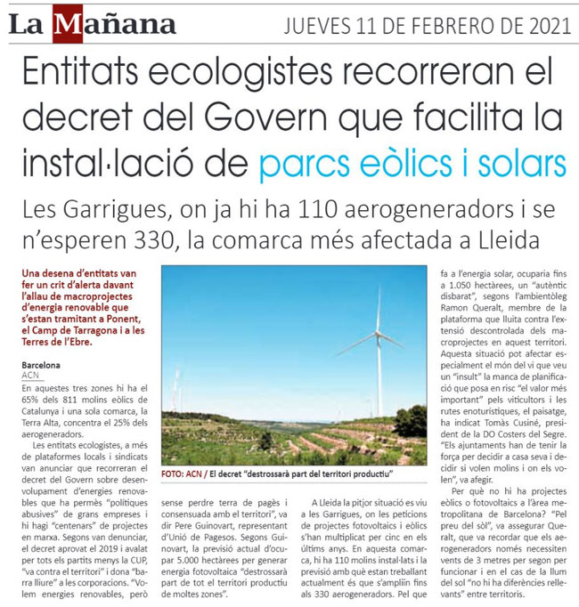 Crit d'alerta d'ecologistes, pagesos i plataformes veïnals contra la massificació de renovables. Ecologistes, pagesos i plataformes veïnals alcen conjuntament la veu per denunciar la massificació de projectes de parcs eòlics i solars que posen en perill, diuen, el futur d'importants espais naturals i agraris del país. Exigeixen que es derogui el decret del 2019 aprovat al Parlament perquè asseguren que promou un model totalment insostenible. Si no ho fa el futur govern que surti de les eleccions de diumenge, portaran el decret a la justícia.